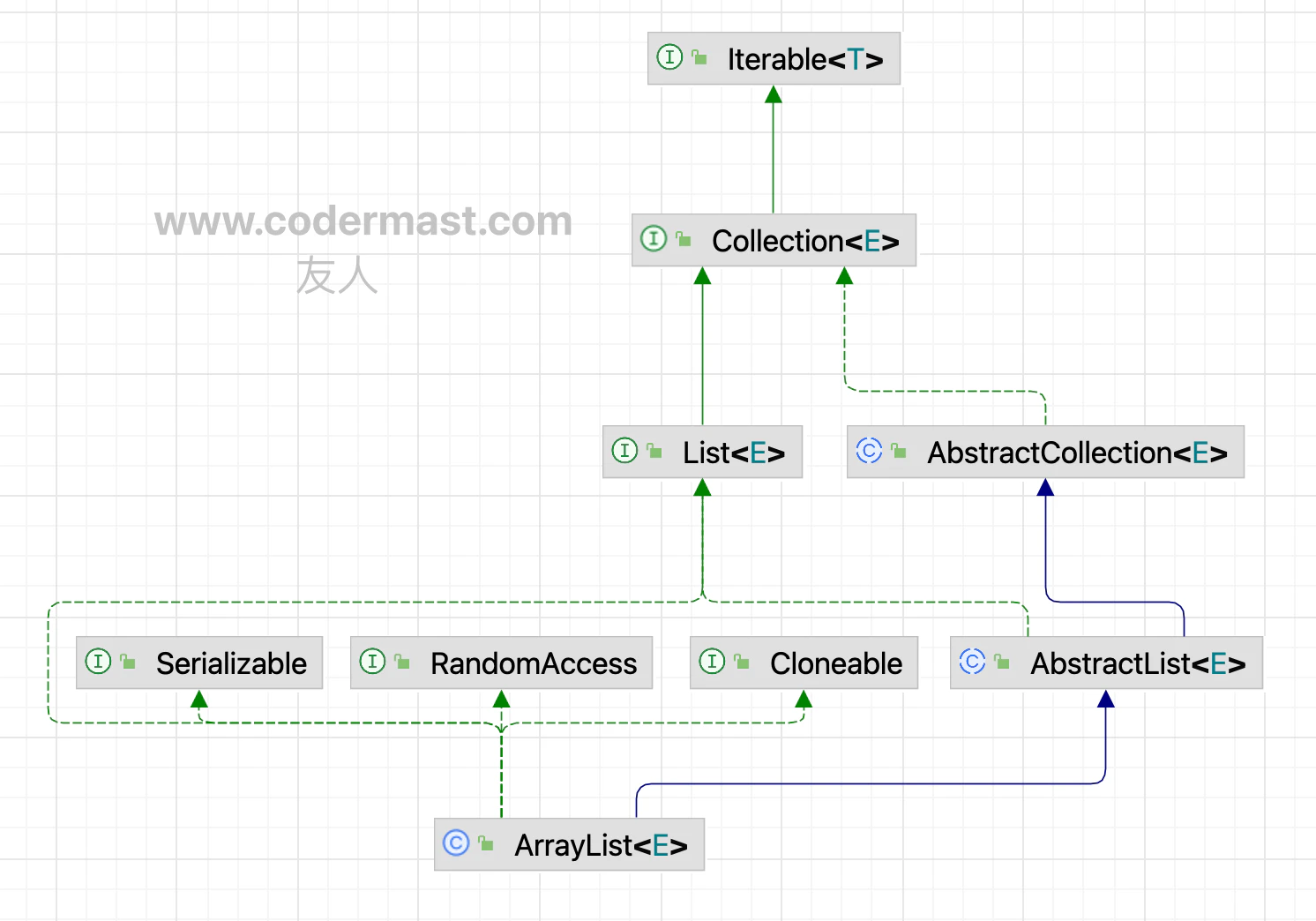 - E : 代表想要存进 ArrayList 中的数据类型,只能是引用类型,想存基本数据类型时,使用其包装类即可。
